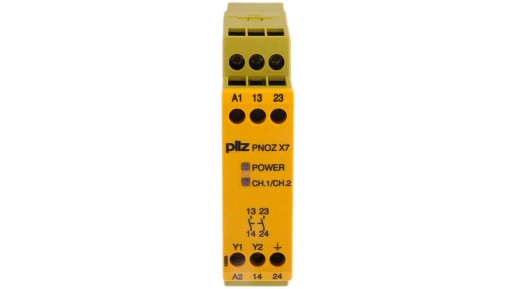 Relè di sicurezza PNOZ X7, 230V ca, 1 canale, 2 contatti di sicurezza N/O, montaggio su guida DIN, funzione di reset automatico o manuale, indicazione di stato LED, circuito di controllo per monitoraggio relé/contatori esterni, ridondanza con monitoraggio automatico, testato ad ogni avviamento, categorie di sicurezza ISO 13849-1: 2, PL ISO 13849-1: e, SIL IEC 61508: 3, dimensioni 87mm x 22.5mm x 121mm.
