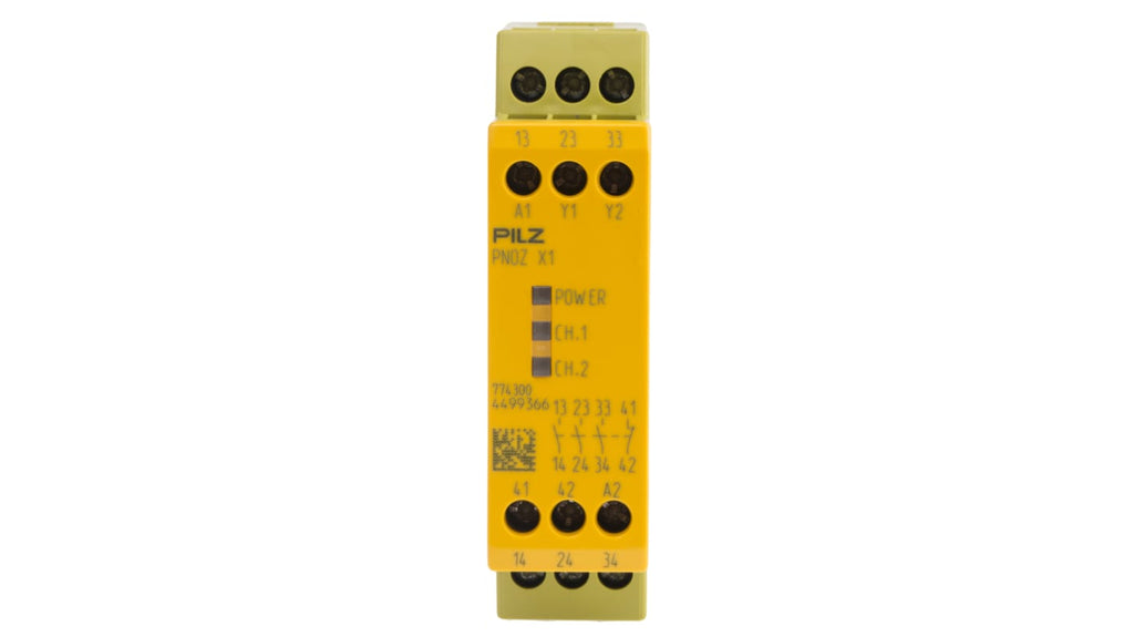 Relè di sicurezza PNOZ X1, ingresso a 1 canale, tensione di alimentazione 24V ca/cc, 3 contatti di sicurezza N/O e 1 N/C, ciclo di controllo a feedback, indicazione a LED per alimentazione e ingresso di canale, alloggiamento 22,5mm, profondità 121mm, lunghezza 87mm, categoria di sicurezza ISO 13849-1: 4, livello di prestazioni E, SIL IEC 61508: 3, metodo di reset automatico e manuale, tipo di terminale a vite.