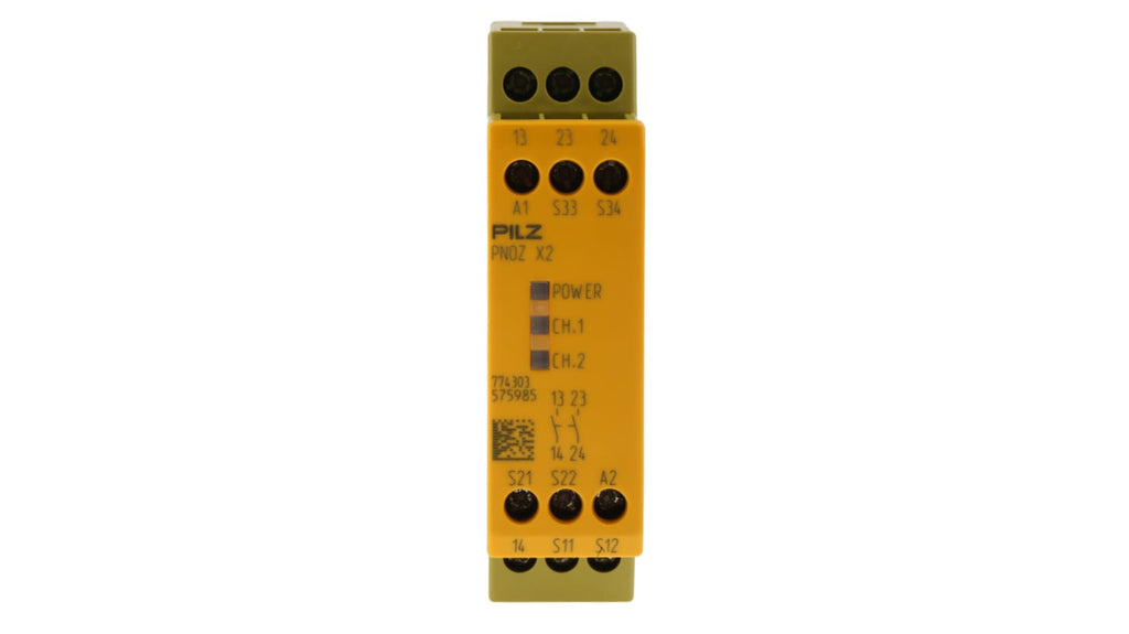 Relè di sicurezza PNOZ X2, alimentazione 24V ca/cc, 2 canali, 2 contatti di sicurezza N/O, ripristino manuale monitorato, montaggio su guida DIN, alloggiamento 22,5mm, ciclo di controllo a feedback, indicazione a LED per alimentazione e canali, conforme a ISO 13849-1 categoria 4, SIL IEC 61508 livello 3, terminali a vite, dimensioni 22,5mm x 121mm x 87mm.