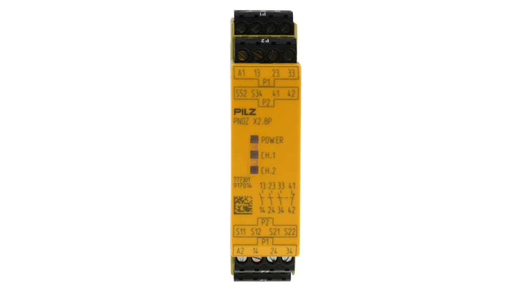 Relè di sicurezza PNOZ X2.8P, tensione di alimentazione 24V ca/cc, 2 canali, 3 contatti di sicurezza, montaggio su guida DIN, terminali a vite, reset automatico e manuale, rilevamento cortocircuiti, display a LED per stato interruttore e tensioni, conforme a EN 60204-1, EN 62061, EN ISO 13849-1, VDE 0113-1, dimensioni 94mm x 22.5mm x 121mm.
