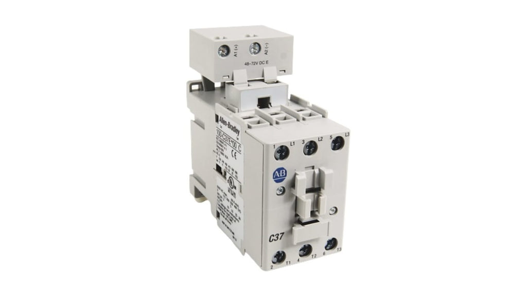 Contattore Rockwell Automation, serie 100-C, 3 poli, 3 NA, 37 A, 26 kW, bobina 24 V c.c., tensione nominale contatto 690 V c.a., protezione IP2X, montaggio su guida DIN da 35 mm, montaggio anteriore e laterale dei contatti ausiliari, moduli di controllo salvaspazio, conformità RoHs, design ecocompatibile, basso consumo energetico, soppressione delle sovratensioni incorporata.