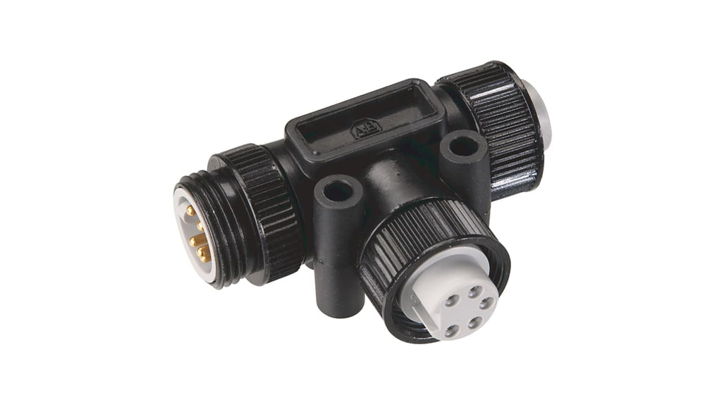 Zoccolo relè Rockwell Automation, serie 1485P, per prodotti DeviceNet, dotato di due connettori miniaturizzati, uno maschio e uno femmina, porta drop, connettore a chiave su caduta verso il connettore femmina del tronco, mini connettore femmina a caduta, diametro connettore 25,4 mm, temperatura d'esercizio -25 gradi Celsius.