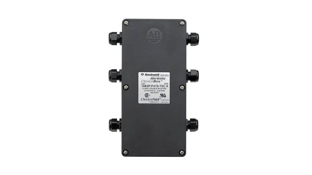 Zoccolo relè Rockwell Automation, serie 1485P, per prodotti DeviceNet, dotato di pressacavi per cavo sottile e collegamento cavo a caduta tramite connettori morsettiera, collegamento cavo tronco tramite connettori morsettiera, posizione della chiave standard, 2 connettori a caduta, temperatura d'esercizio -25 gradi Celsius.