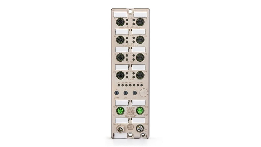Zoccolo relè digitale Rockwell Automation, serie 1732E, auto-configurabile, 16 ingressi e 16 uscite configurabili, tensione di alimentazione 24 V c.c. con gamma da 18 a 30 V c.c., tempo di filtro di ingresso 3 ms, microcontrollore c.c. M12 codificato Lcoded aux, porta doppia diagnostica, dimensioni 7,87 x 2,36 x 1,22 pollici.