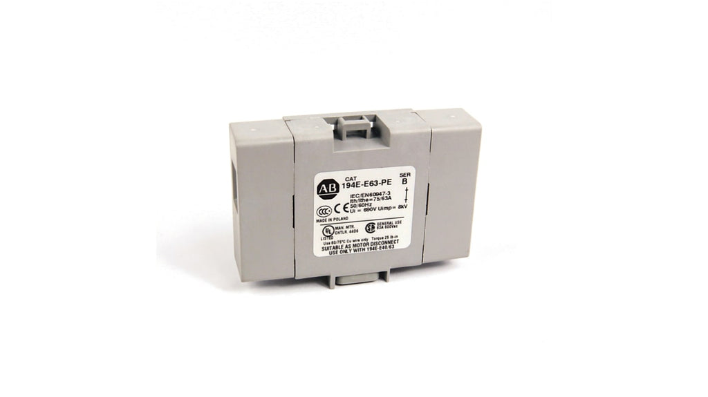 Terminale di messa a terra Rockwell Automation, compatibile con interruttori di scollegamento serie 194E, modelli 194E-E40 ed E63, colore bianco. Dimensioni: larghezza 17.5 mm, altezza 68 mm, profondità 45 mm. Accessorio per applicazioni industriali, progettato per garantire sicurezza e affidabilità nel sistema elettrico.