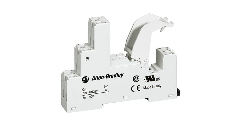 Zoccolo femmina miniaturizzato a 8 lame, serie 700-HN, per relè 700-HK, tensione nominale 300V, corrente 8 A, montaggio su guida DIN o a pannello, compatibile con accessori opzionali per moduli a innesto, clip di fissaggio confezionate separatamente. Struttura terminal protetta.