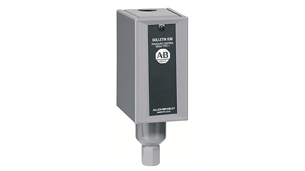 Interruttore di controllo della pressione elettromeccanico, tipo C, con differenziale regolabile. Contatti SPST, 2 circuiti NC, collegamento pressacavo a vite. Dimensioni 65,1 x 185,8 x 62,6 mm. Pressione minima di lettura 2,5 psi, pressione massima di lettura 300 psi. Serie 836. Marchio Rockwell Automation.