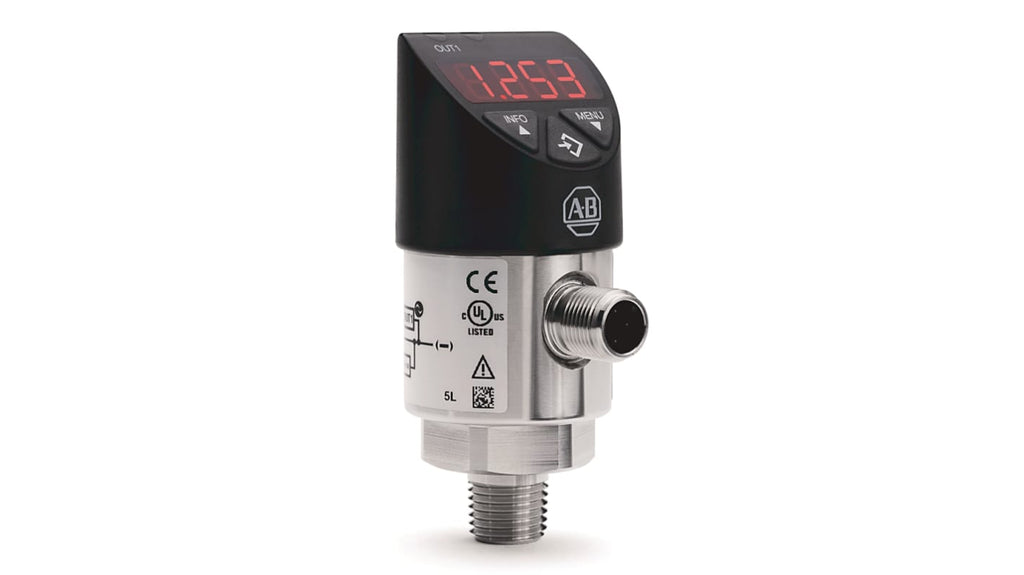 Sensore di pressione relativa Rockwell Automation, pressione massima 1500psi, pressione minima 16psi, uscita analogica, alimentazione 30 V c.c., resistenza alle vibrazioni 10 g, temperatura ambiente da -20 a +80 gradi, durata utile 100 milioni di cicli di commutazione, applicabile per gas, liquidi e vapore, precisione 1,0 percento, serie 836.