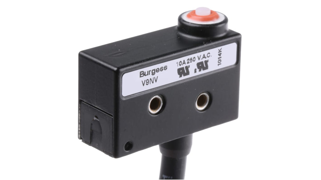 Microinterruttore SPDT pre-cablato, Saia-Burgess, corrente nominale 10 A a 250 V c.a., corpo in metallo, sigillato IP67, contatti in argento, vita meccanica 10^6 operazioni, temperatura operativa -40 a +125 gradi Celsius, montaggio con foro passante, kit di messa a terra incluso, dimensioni 21 mm x 29 mm x 53 mm, autorizzato UL e CSA.