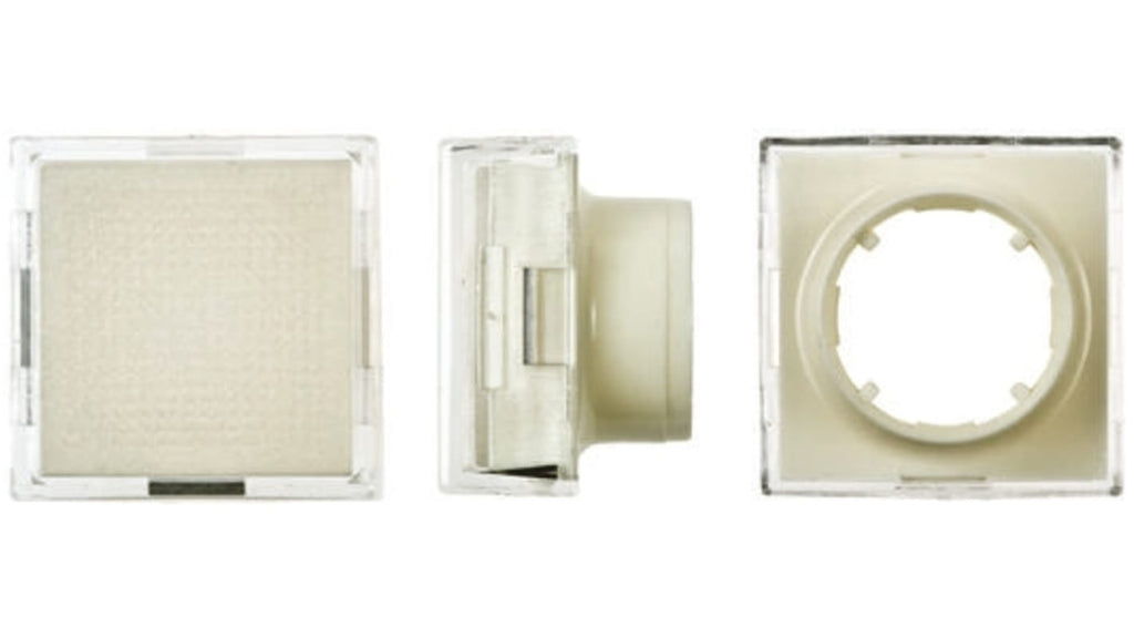 Lente pulsante quadrata per meccanismi di commutazione e indicatori, codice 563011-605, marchio Saia-Burgess. Colore bianco, progettata per uso con la Serie TP2. Grado di protezione IP67, compatibile con interruttori illuminati standard. Forma quadrata, adatta per montaggio a pannello.