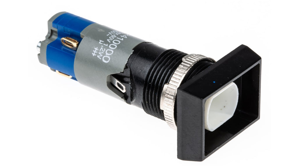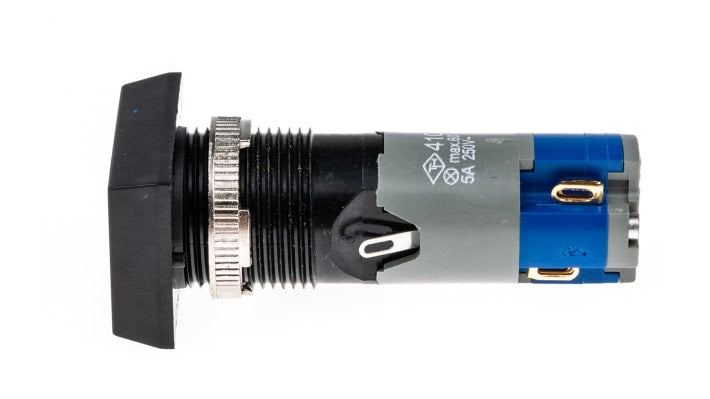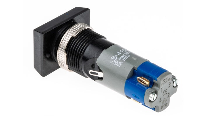Interruttore a pulsante Saia-Burgess, A ritenuta, SPDT, luminoso, 5 A a 250 V c.a., montaggio a pannello. Dimensioni: profondità massima 45 mm, spessore massimo pannello 7 mm, foratura pannello 16,2 mm. Vita meccanica > 106 operazioni. Colore pulsante grigio, contenitore nero, materiale contatto plastica. Possibilità di montare fino a tre blocchi contatto. Codice produttore TH401100625.