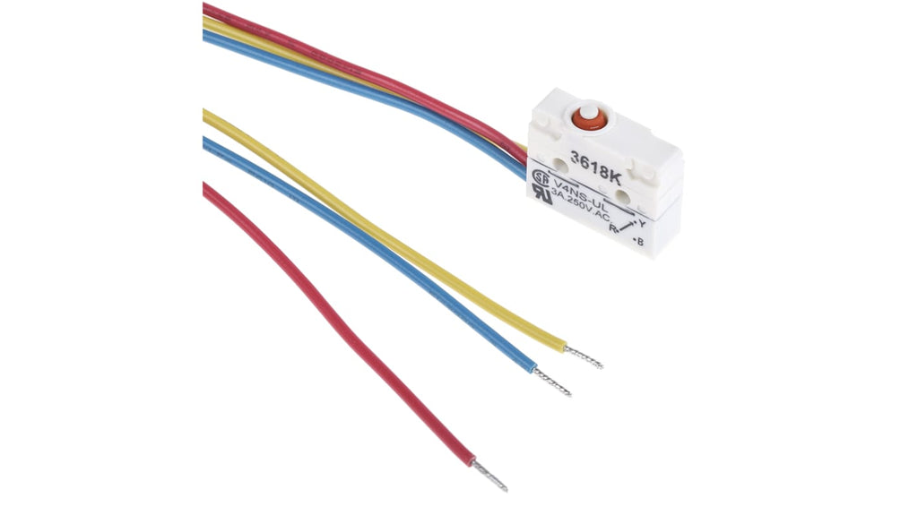 Microinterruttore ultraminiaturizzato, Saia-Burgess, SPDT, pre-cablato, corrente nominale 3 A a 250 V c.a., protezione IP67, temperatura operativa -40 a +85 gradi Celsius, alloggiamento ignifugo UL94-V0, dimensioni 17 x 6,5 x 20 mm, durata meccanica 5000000 operazioni, materiale contatto argento sottile, telaio in nylon rinforzato in fibra di vetro, forza di azionamento 2,5 N, forza di rilascio 0,3 N.