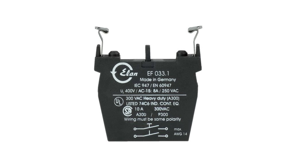 Pushbutton Switch contact block, codice costruttore 101006544, marchio Schmersal. Contenitore in materiale termoplastico rinforzato, autoestinguente, collegamento a vite, flangia di montaggio in posizione 1. Adatto per arresto di emergenza, configurazione contatto 2 NA, tensione nominale 230V ca, vita meccanica minima 10.000.000 operazioni, grado di protezione IP40 per sale di commutazione, IP20 per clip o terminali. Standard EN 60947-5-1, IEC/EN 60947-1.