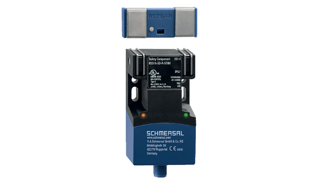 Interruttore di sicurezza senza contatto, tensione 24V cc, tecnologia RFID, protezione IP67, custodia in termoplastico, connettore M12 a 8 poli, cablaggio in serie illimitato, blocco porta con ritenuta magnetica, attuatore magnetico, dimensioni 15mm x 37mm, dotato di 2 LED. Codice costruttore 103044778, marchio Schmersal.