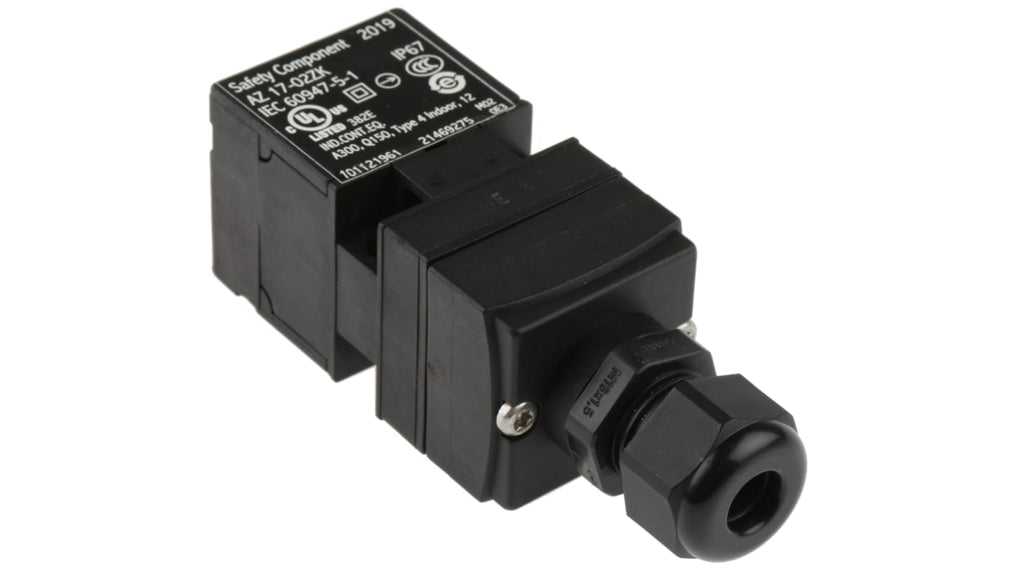 Interruttore di interblocco di sicurezza, blocco a chiave, 2NC, tensione massima 230V c.a. e 24V c.c., corrente massima 4A, grado di protezione IP67, materiale termoplastico rinforzato, dimensioni 85mm x 30mm x 30mm, temperatura operativa da -30°C a +80°C, tipo di connessione M16, attuatore non incluso, progettato per ambienti difficili e applicazioni industriali.