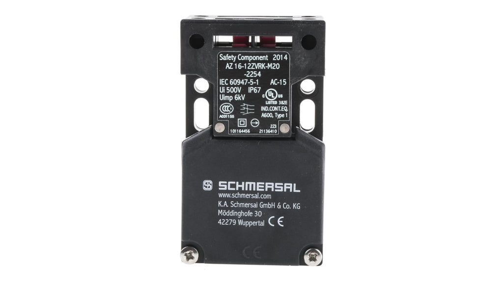 Interruttore di interblocco di sicurezza, tipo a chiave, configurazione 2NC/1NA, tensione massima 230V, corrente massima 4A, grado di protezione IP67, materiale termoplastico rinforzato con fibra di vetro, temperatura operativa da -30°C a +80°C, tipo di connessione M20, dimensioni 90mm x 52mm x 30mm, serie AZ16, contatti in argento, lunga durata meccanica oltre 1 milione di operazioni.