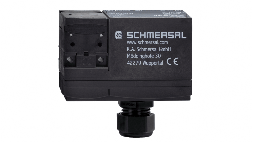 Interruttore di interblocco a solenoide. Tensione di alimentazione 24V ca/cc, configurazione 1NC/1NA, attuatore incluso. Design compatto, contenitore termoplastico, doppiamente isolato. Lunga durata, elevata forza di tenuta, protezione contro il blocco errato. Marchio Schmersal, serie AZM 170.