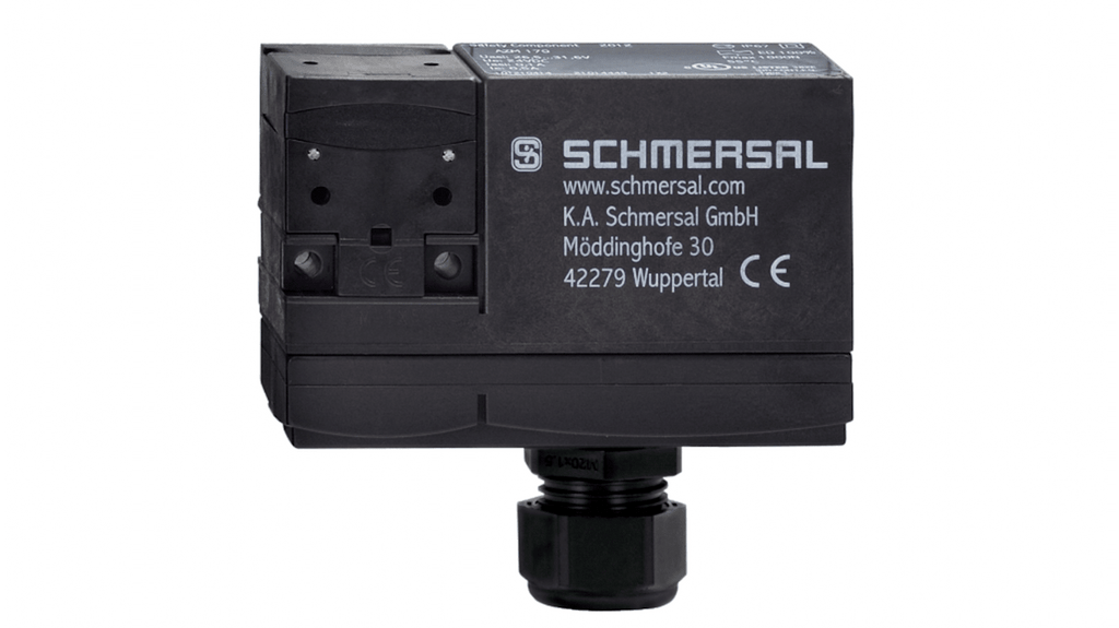 Interruttore di interblocco a solenoide. Marchio Schmersal, modello AZM 170, tensione di alimentazione 24V ca/cc, configurazione stato normale NC. Contenitore termoplastico, design compatto, doppia isolamento, lunga durata, elevata forza di tenuta, attuatore incluso. Protezione contro il blocco errato.