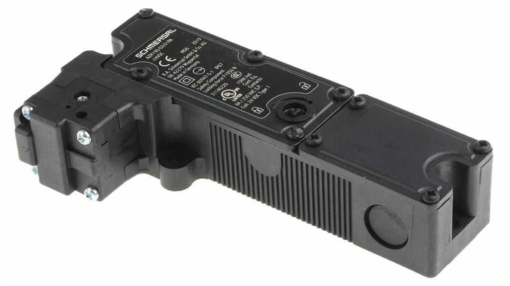 Interruttore di interblocco a solenoide, 24V cc, 2NC/1NA, IP67, serie AZM 190. Dimensioni: 41mm x 29,5mm x 178mm. Materiale custodia: plastica, blocco a vite in acciaio zincato. Consumo energetico: 8.5W. Durata meccanica: 2.000.000 operazioni. Conforme a IEC/EN 60947-5-1 e direttiva RoHS. Ingresso cavo M20. Autorizzatori: BG, UL, CSA.