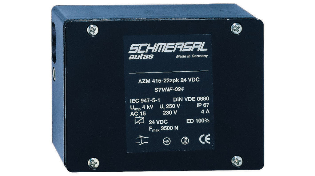 Interruttore di interblocco a solenoide, tensione di alimentazione 110 V c.a., potenza di sblocco, serie AZM 415, contatti di sicurezza 2NC, contatti ausiliari 2NA, grado di protezione IP67, materiale custodia in metallo, dimensioni 46,5 mm x 130 mm x 100 mm, consumo energetico 10 W, temperatura operativa da -25 °C a +50 °C, ingresso cavo 1/2 in NPT.