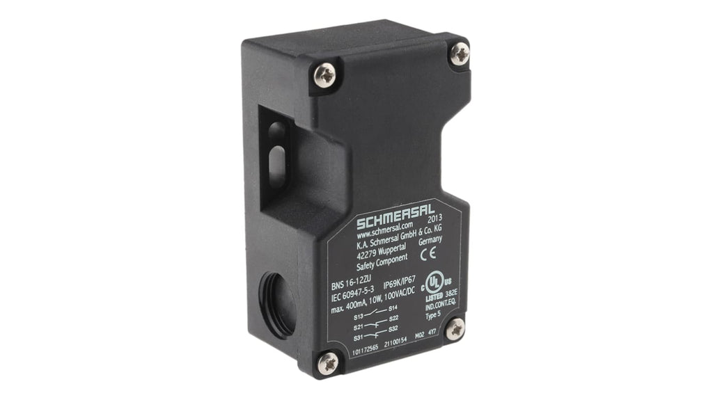 Interruttore di sicurezza senza contatto, tensione 100V ca/cc, tipo di connessione M12, materiale plastico, attuatore magnetico, categoria di sicurezza 4, distanza di commutazione 8 mm (ON), 18 mm (OFF), grado di protezione IP67, dimensioni 90mm x 52mm x 38.5mm, standard soddisfatti BG, CE, EAC, EN ISO 13849-1, IEC 60947-5-3. Attuatore non incluso.