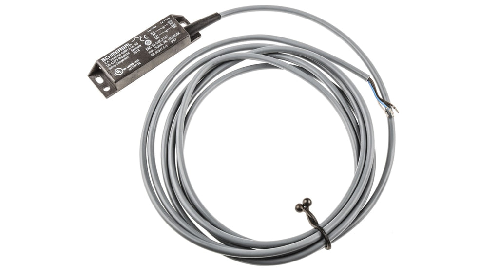 Interruttore di sicurezza magnetico, 2NO, tensione 100V ca/cc, corrente 250mA, grado di protezione IP67, materiale custodia plastica, tipo di connessione cavo, principio sensore magnetico, categoria di sicurezza 4, distanza di attivazione 5-8mm, distanza di apertura 15-18mm, dimensioni 88mm x 50mm x 13mm, temperatura d'esercizio da -25 a +70 gradi. Codice costruttore BNS 33-02Z-2187-3M.