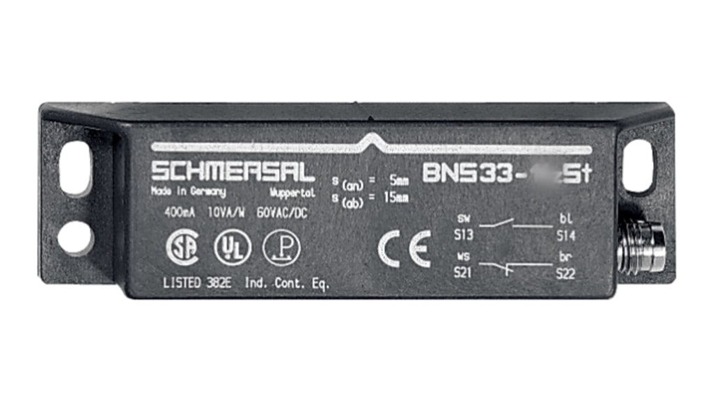Interruttore di sicurezza magnetico, NA/NC, 100V ca/cc, serie BNS33. Grado di protezione IP67, temperatura d'esercizio da -25 a +70 gradi, materiale custodia in plastica, tipo di connessione M8, corrente fornita 400mA, dimensioni 88mm x 25mm x 13mm. Attuatore non incluso, categoria di sicurezza 4, principio sensore magnetico. Utilizzabile per porte, finestre e pannelli di accesso.
