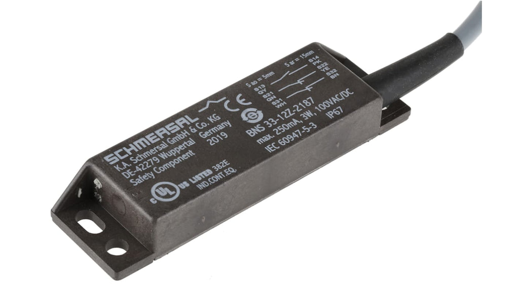 Interruttore di sicurezza magnetico, 120V ca/cc, serie BNS33, codice BNS 33-12Z-2187-2M, custodia in plastica rinforzata, grado di protezione IP67, dimensioni 88mm x 50mm x 13mm, distanza di accensione 5mm, distanza di spegnimento 15mm, montaggio a scomparsa, non include attuatore, categoria di sicurezza 4, principio sensore magnetico, adatto per ambienti industriali.