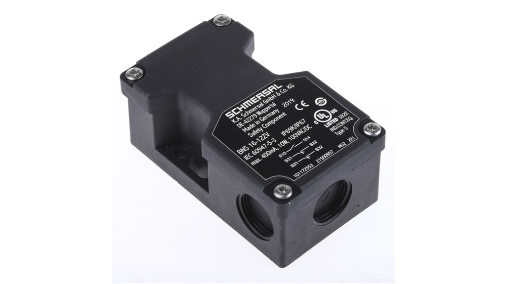 Interruttore di sicurezza magnetico, tensione 100V ca/cc, contatti 2NO/NC, connessione M12, materiale custodia plastica rinforzata, grado di protezione IP67, distanza di attivazione 8mm, distanza di disattivazione 18mm, corrente fornita 400mA, dimensioni 90mm x 52mm x 38.5mm, categoria di sicurezza 4, attuatore non incluso. Autorizzazioni BG, UL, CSA.