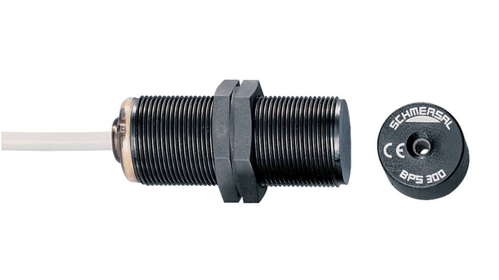 Interruttore di sicurezza senza contatto. Tensione di alimentazione 24V cc, contatti di sicurezza 1, materiale custodia termoplastico rinforzato con fibra di vetro, tipo di connessione cavo, tipo interruttore contatto reed magnetico, tipo di installazione a livello, tipo di attuatore magnetico, principio sensore magnetico, serie BNS 300, protezione IP67, dimensioni 15mm x 37mm.