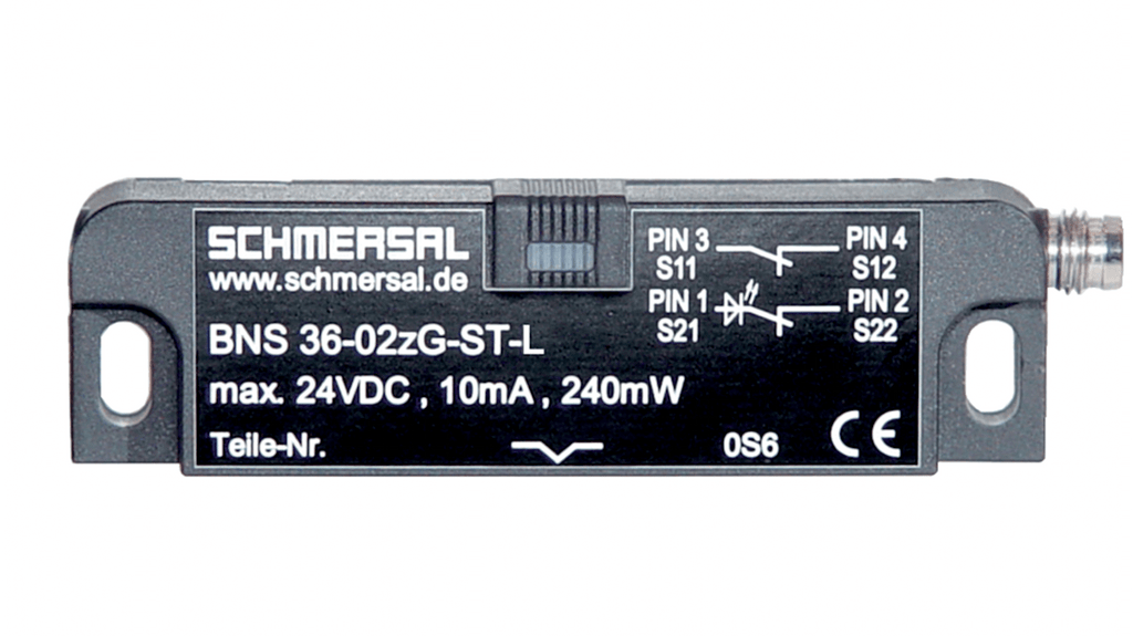 Interruttore di sicurezza senza contatto Schmersal, sensore magnetico insensibile al disallineamento trasversale e allo sporco, contenitore in termoplastico rinforzato con fibra di vetro, contatti di sicurezza, connessione M8, installazione a livello, contatto reed magnetico, attuatore magnetico, grado di protezione IP67, dimensioni 37mm x 15mm, serie BNS 36.