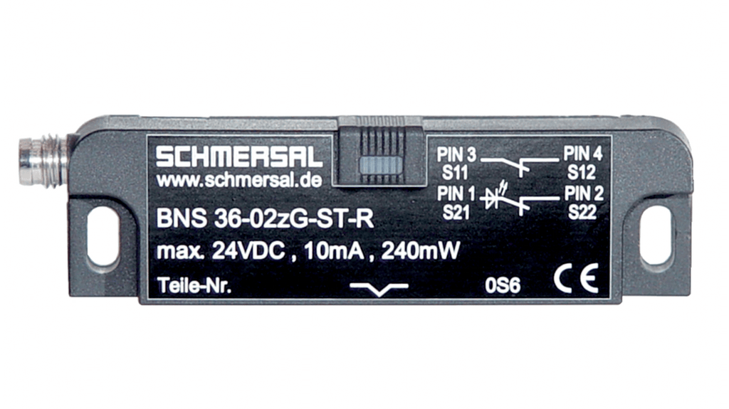 Interruttore di sicurezza senza contatto Schmersal, sensore magnetico insensibile al disallineamento trasversale e allo sporco, contenitore in termoplastico rinforzato con fibra di vetro, contatti di sicurezza, connessione M8, installazione a livello, contatto reed magnetico, attuatore magnetico, grado di protezione IP67, dimensioni 15mm x 37mm, lunga durata, possibilità di montaggio nascosto.