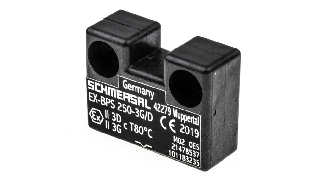 Interruttore di sicurezza senza contatto, attuatore magnetico, dimensioni 13 x 33 x 25 mm, materiale plastico, protezione IP67, certificazione ATEX, certificazione CE, progettato per ambienti industriali difficili, resistenza all'usura, design senza parti meccaniche, compatibile con interruttore EX-BNS 250, applicazioni in protezioni per macchine e robotica.