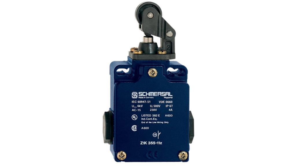 Interruttore di interblocco di sicurezza Schmersal, leva a rullo, 1 contatto ausiliario e 1 contatto di sicurezza, grado di protezione IP67, protezione antiesplosione, tensione massima 230V ca, corrente massima 4A, custodia in lega pressofusa, serie EX-Z.