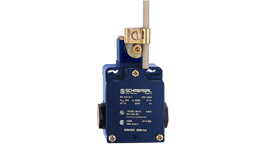 Interruttore di interblocco di sicurezza Schmersal, Asta, 2NC, 230V ca, 4A, IP67. Contenitore in lega pressofusa, senza contatti ausiliari, grado di protezione IP67, protezione antiesplosione. Specifiche: corrente massima 4A, tensione massima 230V ca, configurazione 2NC, serie EX-Z.