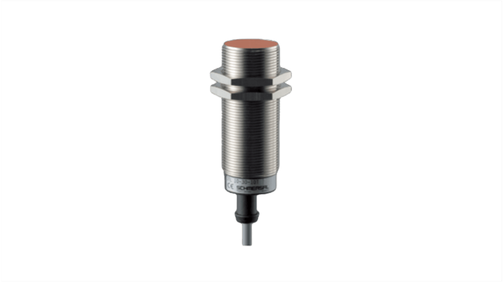 Sensore di prossimità induttivo cilindrico, design M30, tecnologia digitale, gamma di rilevamento 10 mm, tensione di alimentazione 15 a 250 V ac, custodia metallica in ottone, grado di protezione IP67, doppio isolamento, temperatura operativa da -25 a +70 gradi Celsius. Modello IFL 10-30-10T, marchio Schmersal.