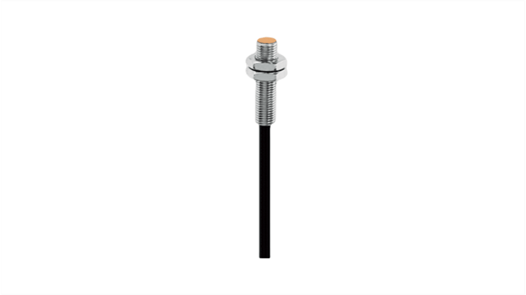 Sensore di prossimità induttivo cilindrico, tecnologia PNP, dimensione filetto M8 x 1, gamma di rilevamento 2 mm, tensione di alimentazione 10-30 V CC, custodia metallica in ottone nichelato, grado di protezione IP67, temperatura ambiente da -25 a +70 gradi Celsius, configurazione a 3 fili in corrente continua. Marchio Schmersal, serie IFL.