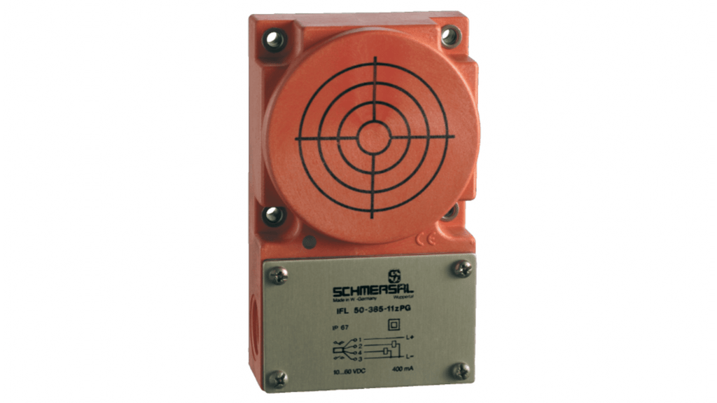 Sensore di prossimità induttivo a parallelepipedo, tecnologia induttiva, uscita PNP, gamma di rilevamento 5 mm, tensione di alimentazione 10 a 60 V dc, grado di protezione IP67, involucro in plastica resistente, classe di protezione II, conforme alle norme DIN VDE 0660-208 e EN IEC 60947-5-2. Codice costruttore IFL 50-385-11P-M20, marchio Schmersal.