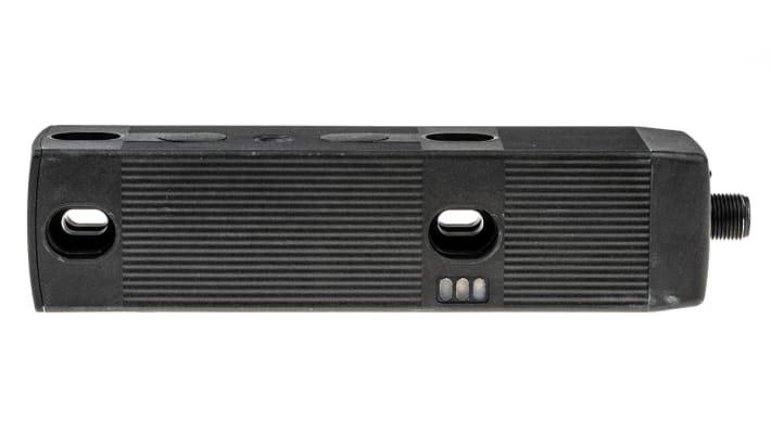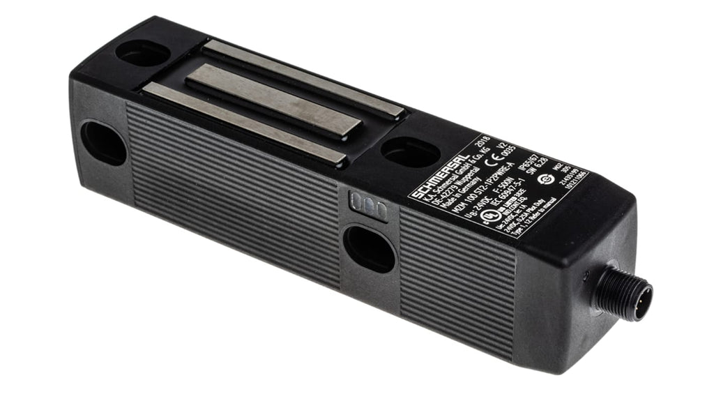 Interruttore di interblocco a solenoide, 24V cc, serie MZM 100, codice MZM 100 ST2-1P2PWRE-A, grado di protezione IP65 e IP67, dimensioni 40mm x 179mm x 40mm, contatti di sicurezza 2 PNP, contatti ausiliari 1 PNP, materiale custodia plastica, ingresso cavo M12, tempo di risposta inferiore a 150ms, tensione massima c.c. 24V, indicatore di stato con tre LED.