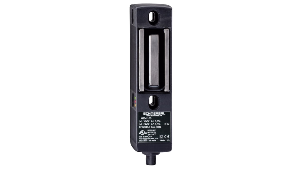 Interruttore di interblocco a solenoide, Schmersal MZM 100, alimentazione 24V cc, forza di bloccaggio 750 N, dimensioni 40 x 40 x 179 mm, materiale custodia plastica, protezione IP65 e IP67, contatti di sicurezza 2 PNP, ingresso cavo M12, range di temperatura da -25 a +55 gradi, standard EN 60947-5-1, EN ISO 13849-1, IEC 61508. Attuatore non incluso.