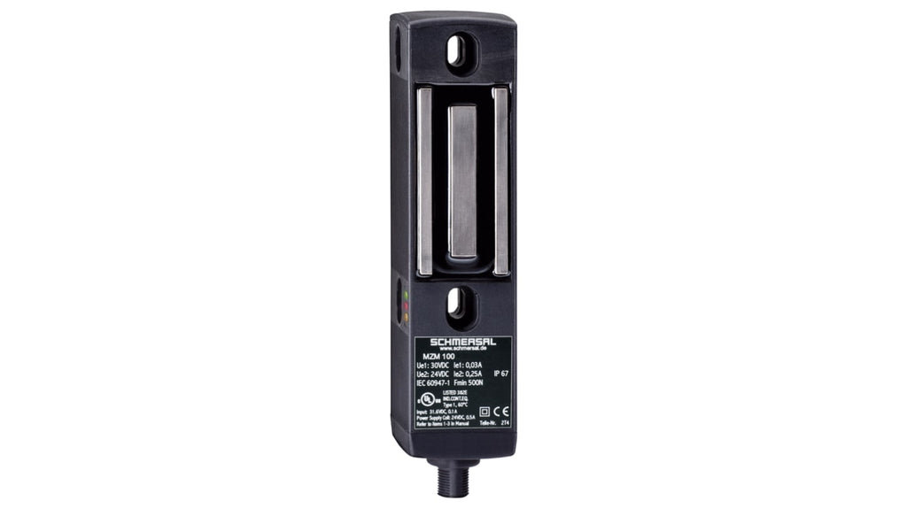 Interruttore di interblocco a solenoide, Schmersal MZM 100, 24V cc, IP65, IP67, con forza di tenuta di 500 N, dimensioni 40 x 179 x 40 mm, contenitore in plastica, 2 contatti di sicurezza PNP, connessione M12, lunghezza massima catena sensore 200 m, tolleranza disallineamento ±5 mm verticale e ±3 mm orizzontale, conforme a EN 60947-5-1, EN ISO 13849-1, IEC 61508. Attuatore non incluso, codice 880-1909 richiesto.