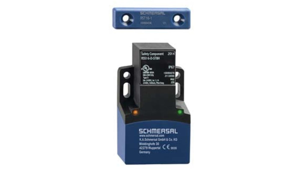 Interruttore di sicurezza senza contatto, tensione di alimentazione 26.4V cc, corrente fornita 2100 mA, terminali a vite, serie RSS16. Involucro in termoplastica rinforzata con fibra di vetro, grado di protezione IP67, dimensioni 91 x 52 x 30 mm, distanza di commutazione 5 mm (On), 15 mm, 30 mm (Off), tecnologia RFID. Standard CE, cULus, EAC, TUV.
