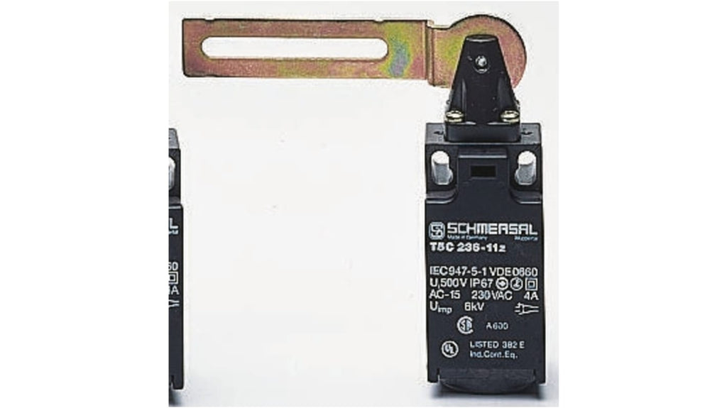 Interruttore di sicurezza a cerniera Schmersal, serie TC 236, configurazione NO/NC, massima tensione 230V AC, 24V DC, corrente massima 4A, grado di protezione IP67, attuatore in acciaio inossidabile, corpo in materiale termoplastico rinforzato, contatti in argento, sistema di contatto ad azione lenta, testina ruotabile in quattro posizioni, conforme a IEC947-5-1/EN60947-5-1. Dimensioni albero 70mm.
