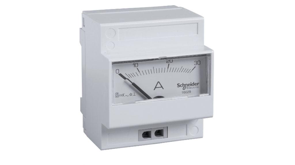 Amperometro analogico da pannello, max 30A, corrente alternata, classe 1.5, elemento mobile a ferro mobile, profondità 66mm, intervallo di misurazione 0 a 30A, temperatura operativa da -25 a +50 gradi Celsius, conforme alle normative IEC, serie Acti9, conformità ROHS, privo di mercurio, premio ecologico conforme. Codice costruttore 16029, marchio Schneider Electric.
