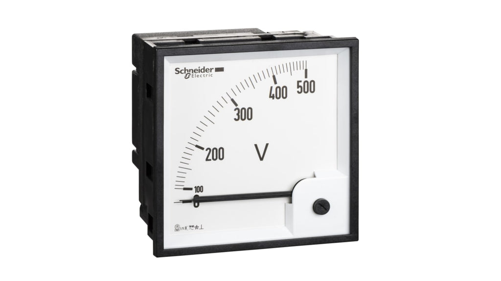 Voltmetro analogico Schneider Electric, display Bilancia da quadrante, dimensioni 96 x 96 mm, struttura ferromagnetica, misurazione tensione 0-500 V, classe di precisione 1,5, consumo energetico 3 VA, resistenza sovraccarichi 1,2 volte tensione nominale permanente, 2 volte per 5 secondi, senza mercurio, conforme RoHS, prodotto verde Premium, grado di protezione IP52.