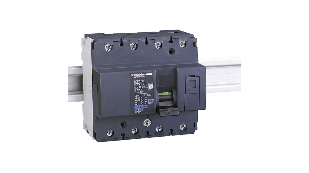 Interruttore magnetotermico Schneider Electric 4 poli 63 A, Tipo C, serie Acti 9, montaggio a clip su guida DIN da 35 mm, grado di protezione IP20, operante in un range di temperatura da -30 a 70 gradi Celsius, controllato tramite interruttore a levetta. Codice costruttore 18739.