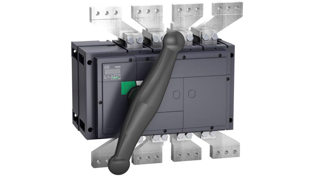Interruttore di isolamento Schneider Electric 31339, 4 poli, corrente nominale 2000 A, grado di protezione IP40, impugnatura rotante anteriore, indicatore di posizione dei contatti, prodotto verde premium, impugnatura nera, compatto, integrato.