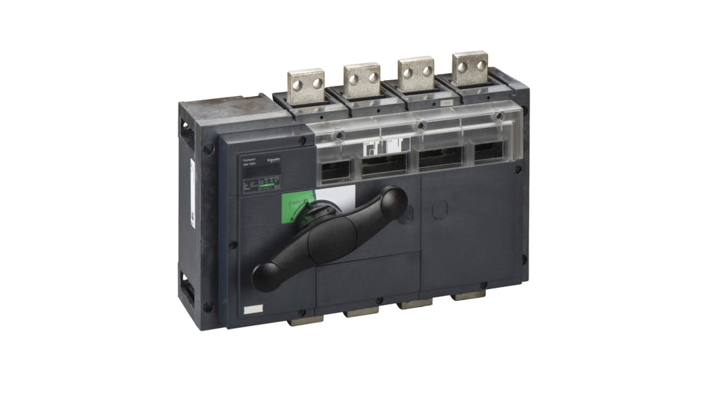 Interruttore di isolamento Schneider Electric 31361, 4 poli, corrente nominale 1000 A, grado di protezione IP40, impugnatura rotante anteriore, indicatore di posizione dei contatti, prodotto verde premium, impugnatura nera, compatto, integrato.