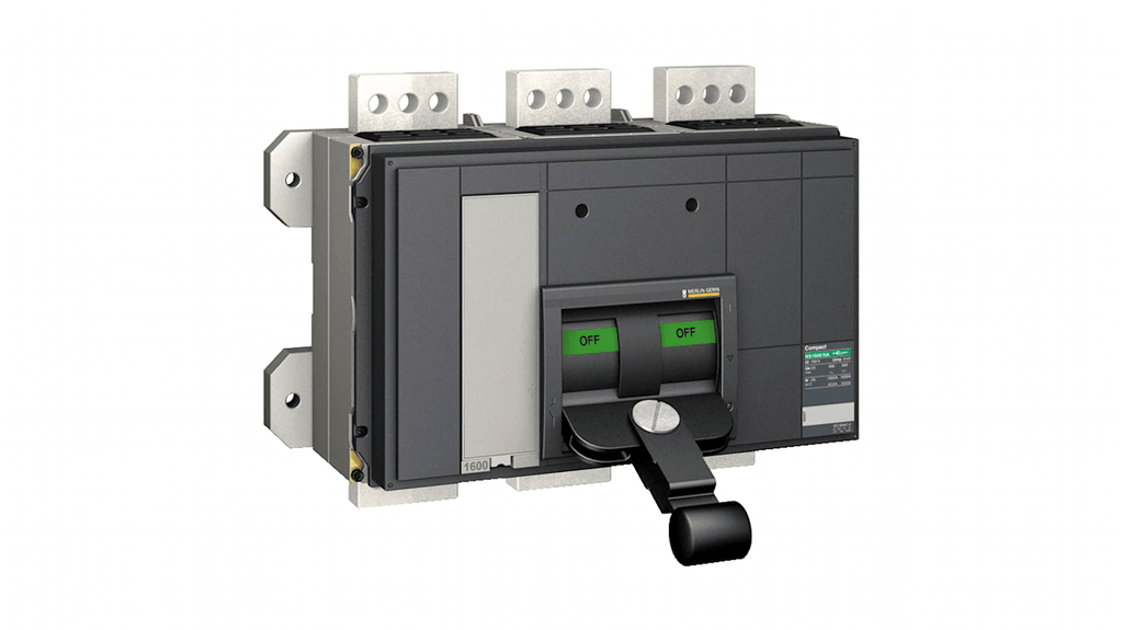 Sezionatore con interruttore Schneider Electric, modello ComPact NS, configurazione a tre poli, corrente massima 3200A, tensione operativa nominale 690 V c.a., dimensioni 350 mm x 420 mm x 160 mm, design compatto, integrato.