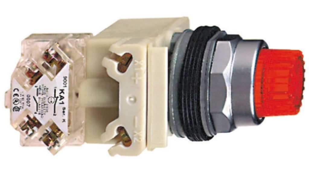 Pulsante luminoso SPDT per montaggio a pannello, IP66, diametro foratura 30 mm, colore rosso. Tensione di alimentazione 24 V o 120 V AC/DC, funzionamento a ritorno di molla. Fornito con lente e LED estremamente luminoso montato su base BA9s, 1 blocco di contatto di commutazione. Temperatura operativa da -25°C a +70°C, conforme a IEC 947-1, IEC 947-5-1, UL 508. Codice produttore 9001K2L38LRRH13.